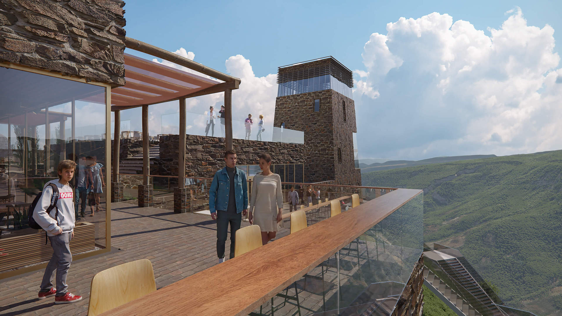 Гости смогут пройти по краю обрыва по каскадным лестницам и смотровым, увидеть спины орлов и бирюзовый Сулак где-то там внизу.